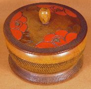 Painted Peonies Dresser BoxA burned and painted floral pattern, further embellished with lots of lathe chatter on the top of the lid, the side of the box and base, and even on the bottom.#001: $75.00